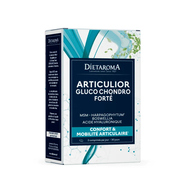 Dietaroma Gluco Chondro Forte est un complément articulatoire complet qui associe des ingrédients clés comme la glucosamine et la chondroïtine, reconnus pour leur rôle dans la protection et la régénération du cartilage. Ce produit est conçu pour les personnes souffrant de douleurs articulaires, d’arthrose ou de raideurs, et qui cherchent à renforcer leurs articulations et à améliorer leur souplesse. En plus de la glucosamine et de la chondroïtine, la formule contient des vitamines et des minéraux qui favorisent la santé des os et des tissus conjonctifs. Les 60 comprimés permettent une cure prolongée pour un soutien articulaire durable.