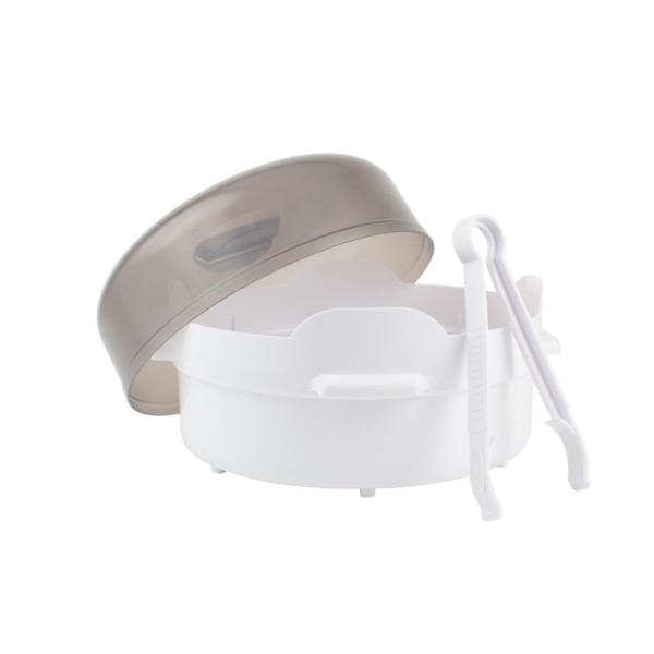 Le stérilisateur à micro-ondes tue les bactéries nocives par la vapeur. Pour le nettoyage intensif et hygiénique des tétines en biberons. Fonctionne en toute sécurité simple et rapide. Stérilise 4 biberons et tétines en même temps. D’abord lu le manuel.